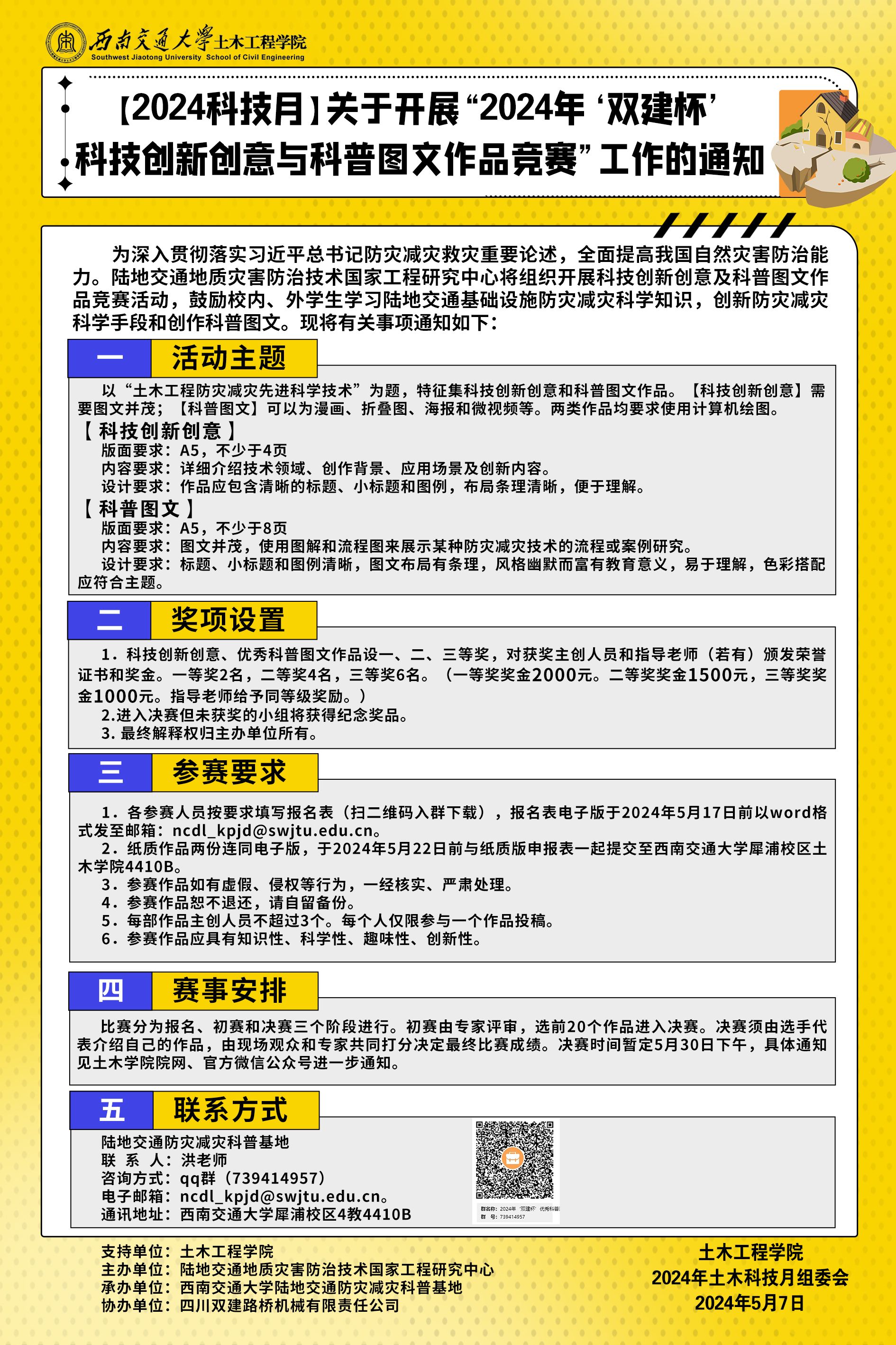 以“土木工程防灾减灾先进科学技术”为题,特征集科技创新创意和科普图文作品。【科技创新创意】需要图文并茂;【科普图文】可以为漫画、折叠图、海报和微视频等。两类作品均要求使用计算机绘图。